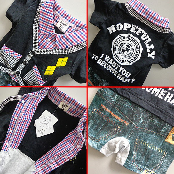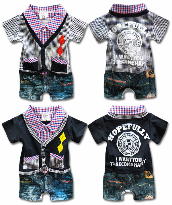 韓国子供服 半袖ロンパース【アーガイルカーディガン重ね着風チェックシャツベビー 半袖カバーオール(半袖ロンパース)】韓国子供服 70cm 80cm3980円以上送料無料 韓国子供服 子供服 ロンパース 半袖 前開き カバーオール ロンパース半袖ロンパース 男の子 女の子