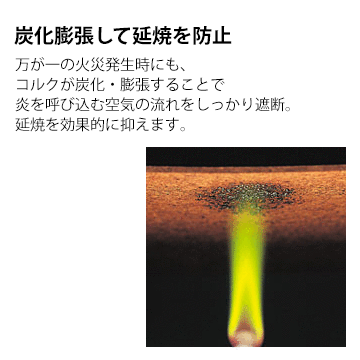 万が一の火災発生時にも、コルクが炭化・膨張することで炎を呼び込む空気の流れを遮断します。